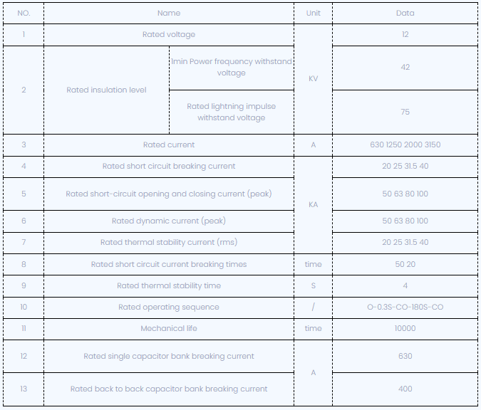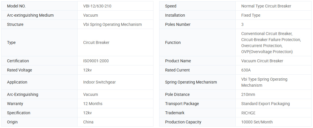 Wewnętrzny wyłącznik próżniowy VBI-12 jest trójfazowy AC 50 Hz, napięcie znamionowe urządzenia wewnętrznego 12 kV, dla przedsiębiorstw przemysłowych i górniczych, elektrowni i podstacji jako celów kontroli i ochrony sprzętu elektrycznego oraz do częstego działania miejsca. Połączył technologię Korporacji ABB w Szwajcarii. Produkt jest zgodny ze standardowym GB1984 i IEC62271-100.