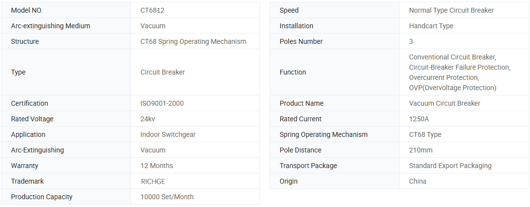 Wyłącznik próżniowy CT68-12 ma prostą strukturę, wysoką pojemność zerwania, długą wytrzymałość, wszechstronne funkcje operacyjne, brak wybuchowych niebezpieczeństw i wygodna konserwacja. Jest dopasowany do kontrolowania systemu transportu i ochrony przełącznika w podstacji potęgi i transformatorów, szczególnie do przełamania ważnego obciążenia lub częstych operacji w niektórych miejscach.