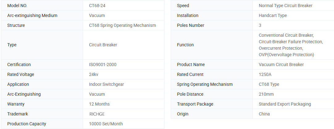 CT68-24 wyłącznik próżniowy jest wewnętrznym wyłącznikiem obwodów próżniowych wysokiego napięcia, stosowanego głównie w systemach zasilania rozproszonych, kopalniach, ropy naftowej, przemysłu chemicznym, metalurgii, budownictwie, transporcie, kopalniach węgla i gminach, a także w systemach zasilania i dystrybucji miejskich budynków mieszkalnych i innych miejscach. Jest szeroko stosowany do ochrony sprzętu do zasilania wysokiego napięcia przed nadmiernym prądem, zwarciem, niedostatecznym napięciem i nadmiernym napięciem oraz może wiarygodnie zagwarantować bezpieczne działanie sprzętu zasilania.