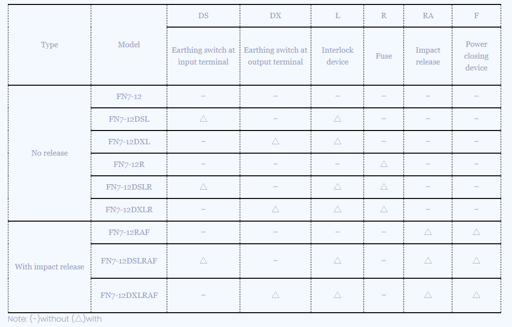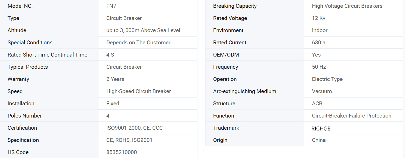 Wysokonapięciowy wyłącznik obciążenia FN7-12 AC to nowy typ wewnętrznego wyłącznika obciążenia wysokiego napięcia wytwarzającego gaz. Nadaje się do trójfazowych systemów zasilania prądem przemiennym o częstotliwości prądu przemiennego 50 Hz i napięciu znamionowym 12 kV. Służy do wyłączania prądu obciążenia i zamykania prądu zwarciowego.
