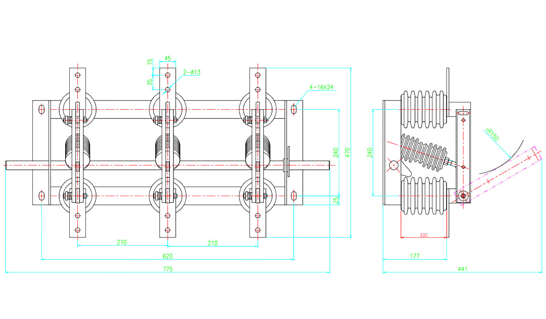 - Jednokolumnowy wyłącznik izolacyjny: Bezpośrednio wykorzystaj pionową przestrzeń pod napowietrzną szyną zbiorczą jako izolację elektryczną, oszczędzając miejsce, redukując przewody łączące i zapewniając wyraźne stany rozłączenia, szczególnie odpowiednie do przesyłu bardzo wysokiego napięcia.