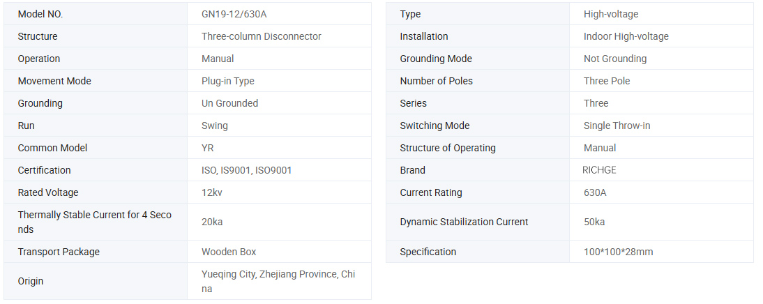 Wyłącznik wysokiego napięcia prądu przemiennego serii GN19-12(c) nadaje się do systemów zasilania AC 50 Hz, znamionowego napięcia roboczego 12 kv, 10 kv, znamionowego prądu roboczego 400 A, 630 A, 1250 A, jako napięcie i brak obciążenia pod warunkiem zerwania, rozdzielnica wewnętrzna z obwodem zamkniętym. Napięcie znamionowe 12 kv i niższe, system zasilania, wyposażony w ręczny mechanizm obsługi, używany do przełączania urządzeń elektrycznych pod warunkiem napięcia, ale bez obciążenia, są również wysyłane do produkcji urządzeń przeciwporostowych, typu plateau i urządzeń wyświetlających na żywo, które można zainstalować. Wewnętrzny wyłącznik wysokiego napięcia serii GN19-12 jest urządzeniem wewnętrznym o napięciu znamionowym 12 kv i trójfazowym prądzie przemiennym 50 Hz.