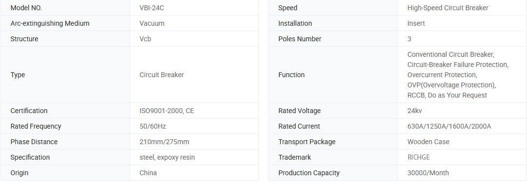VBI-24 średnie napięcie wyłącznika próżniowego jest rodzajem sprzętu do przełącznika średniego napięcia o średnim napięciu o wysokości 50 Hz/60 Hz z trójfazowym napięciem AC 24 kV, które łączyło technologię ABB Corporation w Szwajcarii i rozwinięte w Chinach. Produkt jest zgodny ze standardowym GB1984 i IEC62271-100.