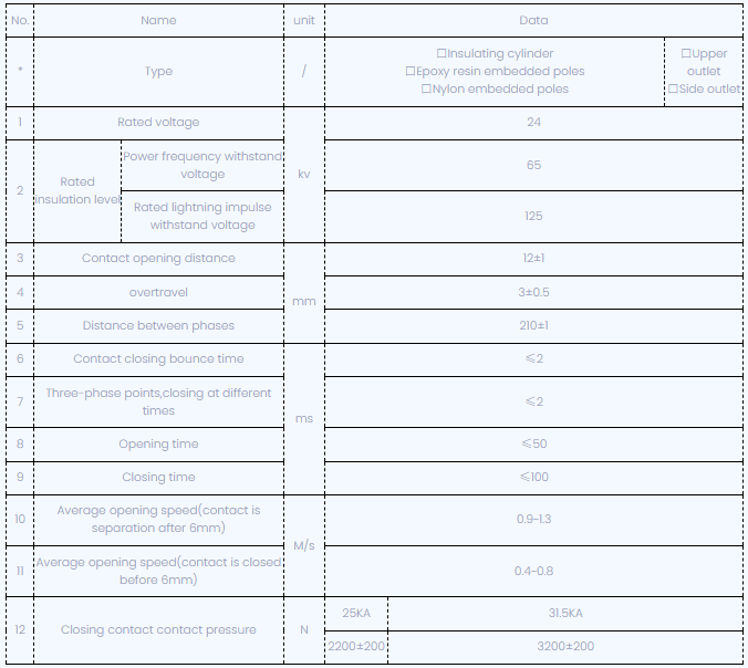 Główna specyfikacja techniczna VCB montowanego bocznego typu VBI-24
