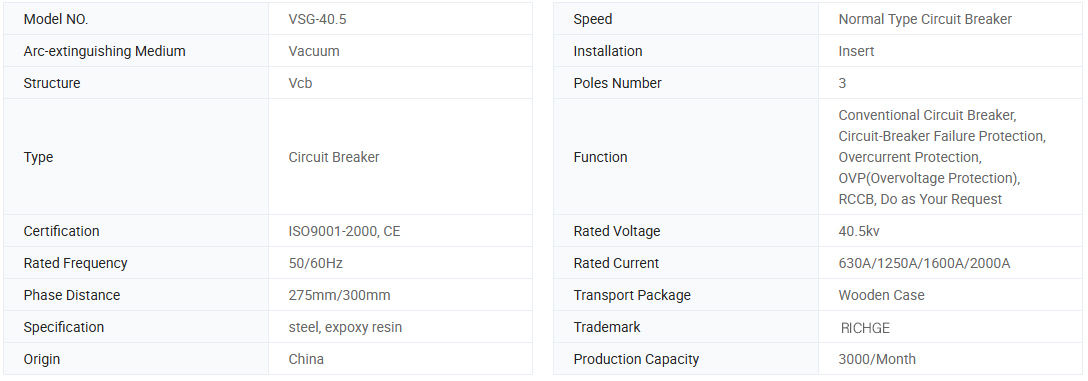 VSG-40.5C Rodzaj instalacji bocznej wewnętrznej wyłącznika próżniowego Hals Wysokie napięcie wykorzystywało sprężynę do magazynowania energii. Mechanizm działający może być obsługiwany na dwa sposoby, poprzez obsługę ręczną i elektromotoryczną, właściwości są zgodne z wyłącznikiem AC o wysokim napięciu, JB3855-1996 3,6-4.5 kV Wystawę AC High Voltage AC i IEC Standard 62271-100: 200162271-100: 2001 Wolacyjny przerywnik AC AC i IEC